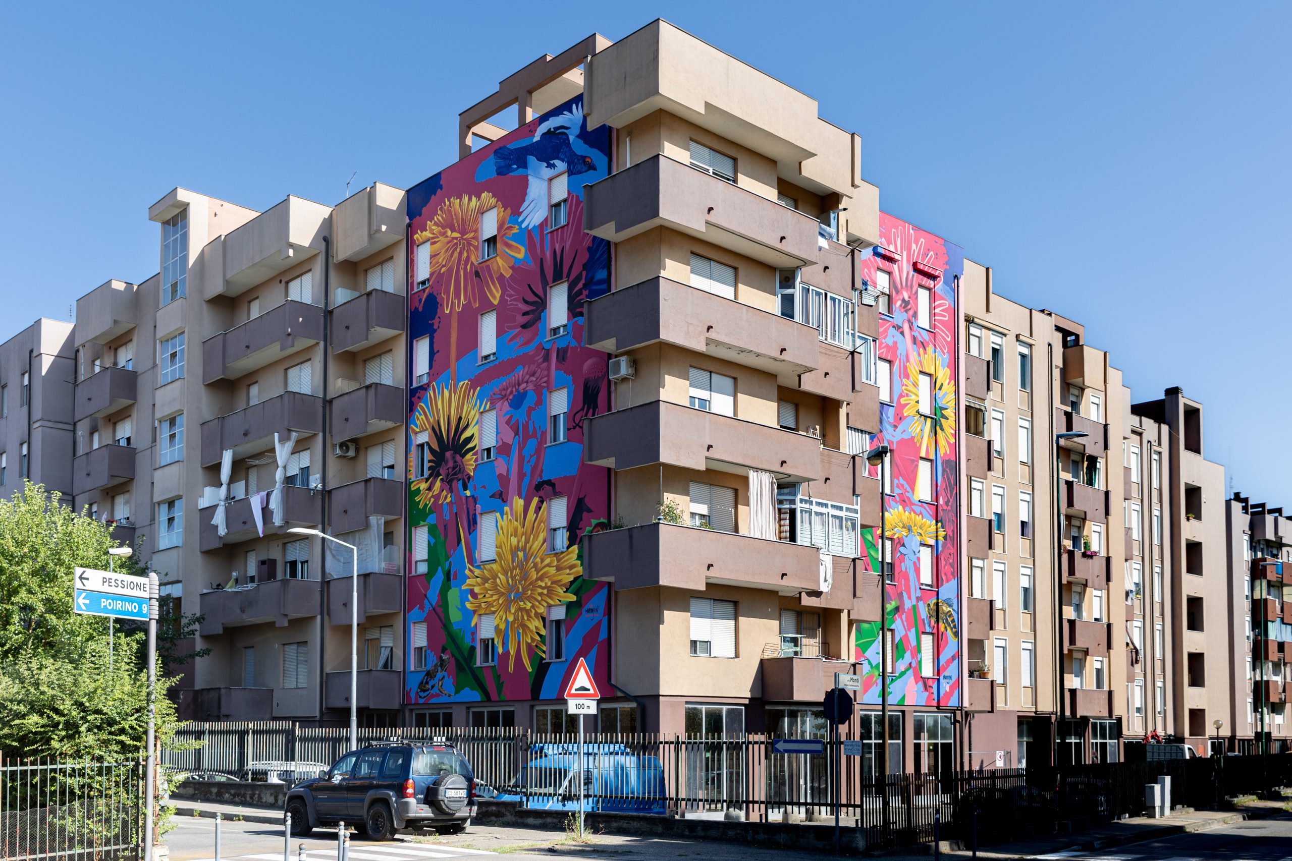 E’ il titolo dell’opera murale di Mario Jin: ha uno sfondo astratto con toni di magenta, viola e azzurro, arricchito da trame naturali con piante comuni della flora italiana. Risaltano i fiori di tarassaco per creare una geometria decorativa: si mimetizzano, tra le colorazioni, animali a rischio estinzione come le api, le coccinelle, una pernice bianca e il rospo fosco, ricordandoci l’importanza di proteggere la biodiversità di fronte ai cambiamenti climatici sempre più evidenti. L’opera sottolinea anche la tenacia e la forza della natura capace di contrastare questi fenomeni e di riproporsi sempre in tutta la sua vitale bellezza.